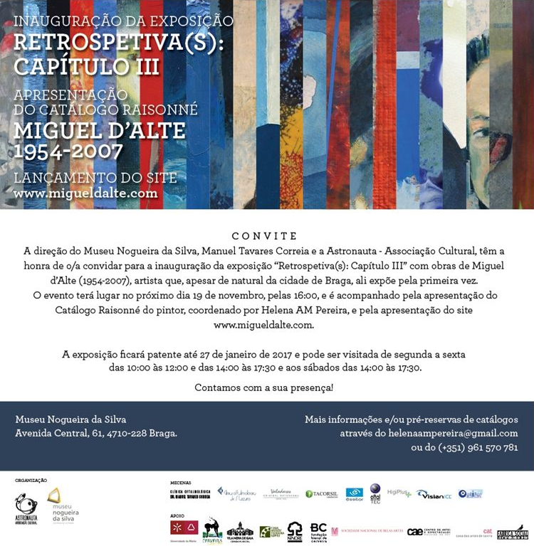 Exposição "Retrospetiva(s): Capítulo III", de Miguel d'Alte (1954-2007), de 19 de novembro a 27 de janeiro de 2017, no Museu Nogueira da Silva (MNS), uma unidade cultural da UMinho no centro de Braga. Inauguração a 19 de novembro, pelas 16h00, incluindo a apresentação do catálogo "Raisonné" e o lançamento do site oficial do pintor. Visita guiada a 7 de janeiro, às 16h00, pela curadora Helena Pereira, aberta ao público mediante inscrição prévia para sec@mns.uminho.pt. Iniciativa organizada pela associação cultural Astronauta e pelo MNS. Entrada livre, de terça a sexta-feira, das 10h00-12h00 e 14h00-18h00 e ao sábado das 14h00-18h30.
