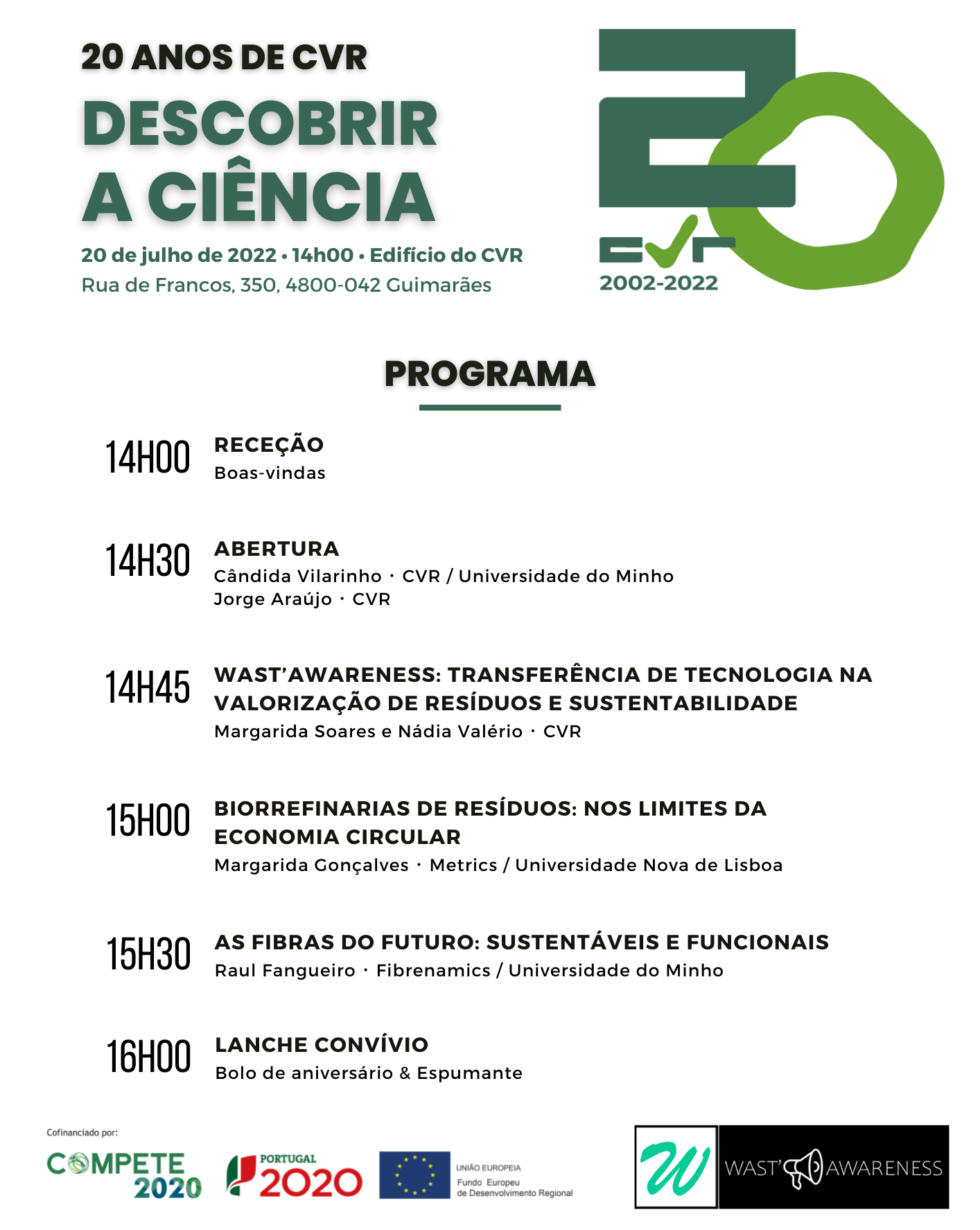 O CVR - Centro para a Valorização de Resíduos da Universidade do Minho celebra os seus 20 anos com o evento “Descobrir a Ciência”, que se realiza a 20 de julho, das 14h30 às 16h00, no seu edifício do campus de Azurém, em Guimarães.