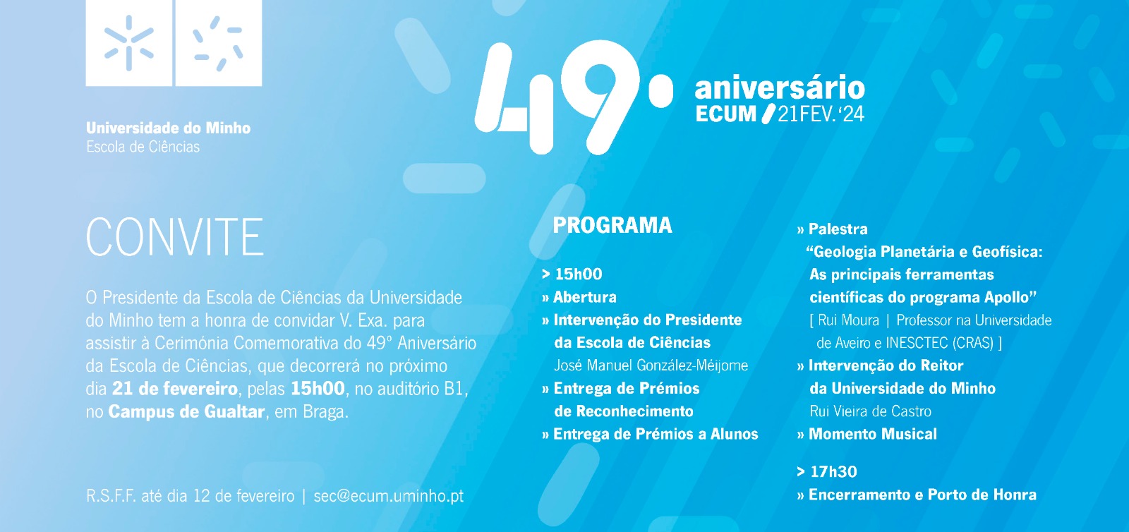 A Escola de Ciências da Universidade do Minho (ECUM) assinalou o seu 49º aniversário no dia 21 de fevereiro, com uma cerimónia pelas 15h00, no auditório B1 (edifício 2) do campus de Gualtar, em Braga. A sessão foi transmitida em simultâneo no