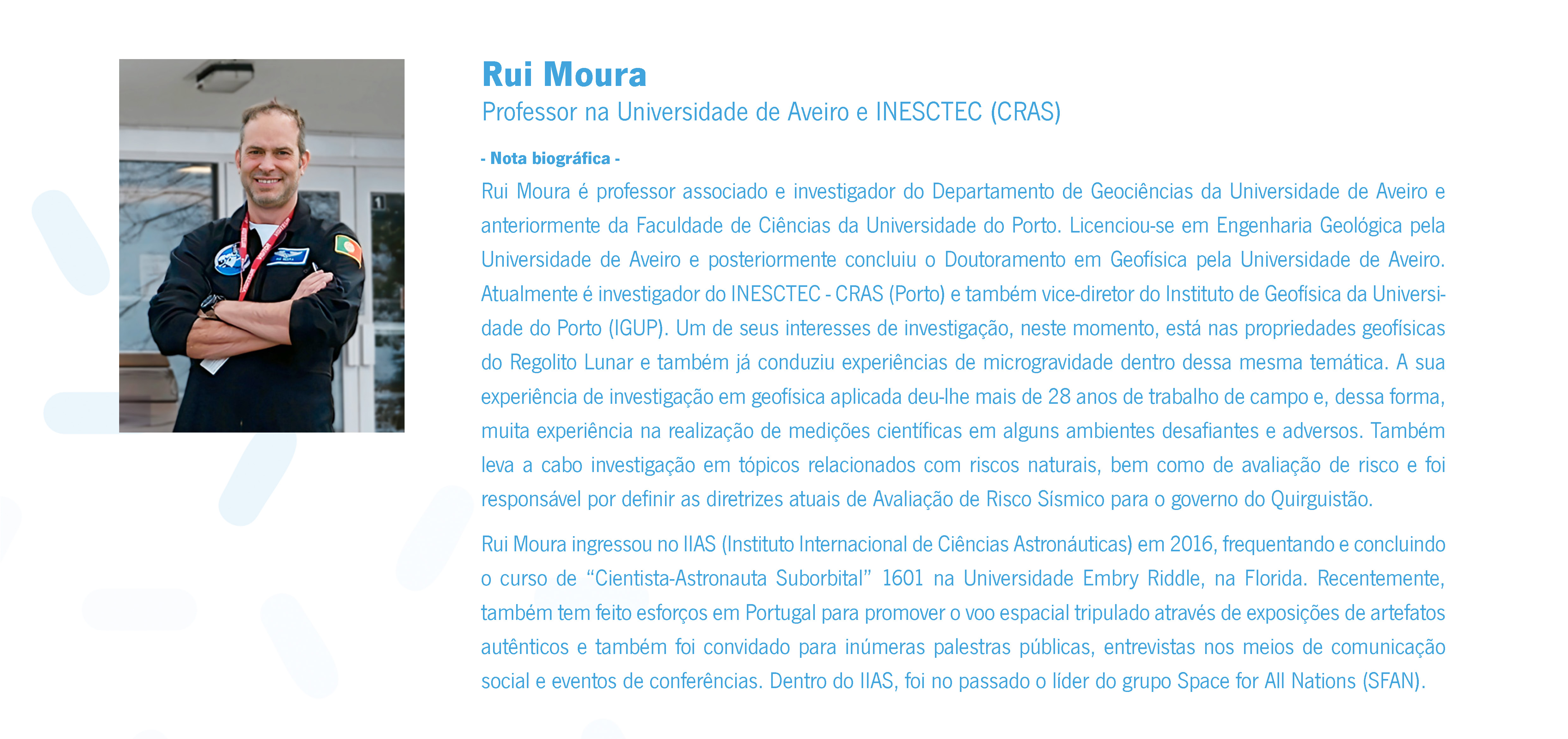 O programa prosseguiu com a palestra “Geologia planetária e Geofísica: as principais ferramentas científicas do programa Apollo”, por Rui Moura, professor da Universidade de Aveiro, que estuda as propriedades do solo lunar, conduziu experiências de microgravidade e promove o voo espacial tripulado através de exposições de artefactos.