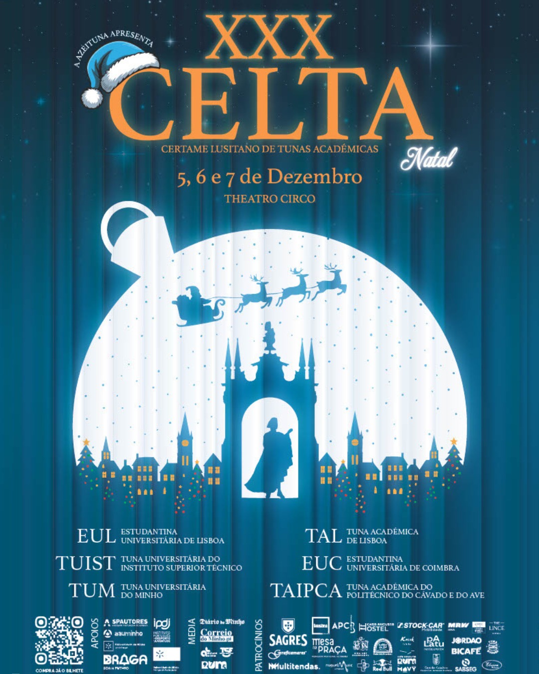 A 30ª edição do Certame Lusitano de Tunas Académicas (CELTA) realiza-se de 5 a 7 de dezembro, a partir das 21h00, no Theatro Circo, em Braga, com o tema "Natal" e algumas das melhores tunas do país. A iniciativa da Azeituna - Tuna de Ciências da UMinho, com apoio do Município de Braga, junta tradição, música e espírito natalício.